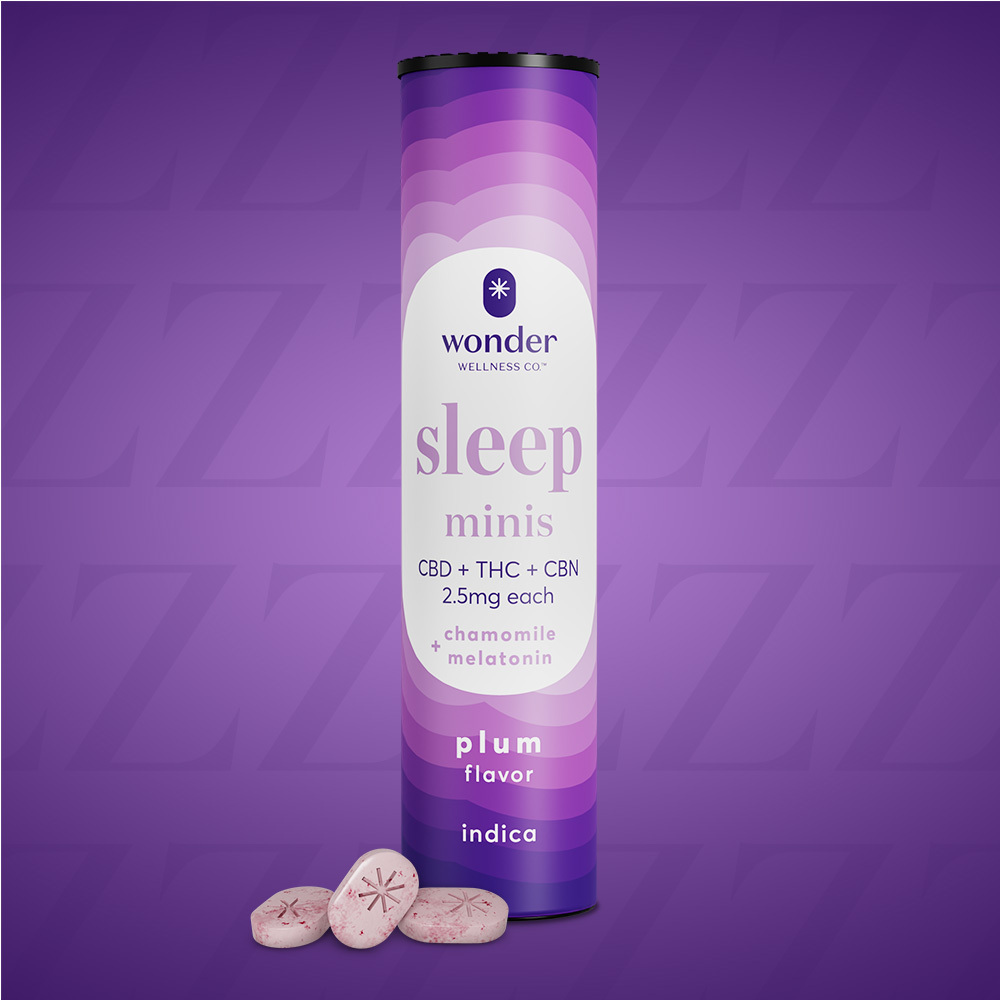 Snooze or slumber: you choose. Each sleep mini has 2.5mg of indica THC, 2.5mg of CBD, and 2.5mg of CBN, providing a blanket of rest whenever you need it. When looking for sedative effects, CBD paired with CBN creates a functional sleep-aid. A rich, soothing, and comforting plum flavor. Enhanced with chamomile and melatonin, which may help with calming nerves and managing insomnia. Ideal for: snoozing early internal alarm clocks, catching up on shut eye, or putting your brain to bed. Great for your first time or building the ideal high. Visit wonderwellness.co/faq for more information on our use of botanicals and cannabinoids.